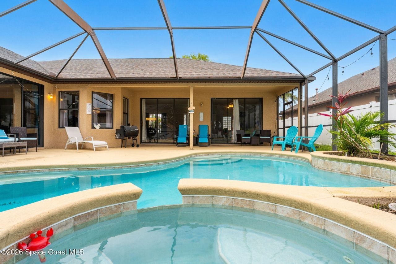 UPDATED WATERFRONT POOL HOME IN THE HEART OF MERRITT ISLAND!Experience true Florida living from your expansive screened lanai, complete with a private pool and spa overlooking waterfront views. This beautifully maintained 4-bedroom, 3-bath, 3-car garage home offers the perfect blend of comfort, space, and lifestyle. Step inside to a light-filled, open split floor plan designed for both everyday living and entertaining. The gourmet kitchen is the centerpiece of the home, featuring solid wood cabinetry, granite countertops, stainless steel appliances, recessed lighting, a large island, and breakfast bar. The spacious primary suite is a true retreat with walk-in closets, dual vanities, and a spa-like bath including a soaking tub and separate walk-in shower. Enjoy peace of mind with major updates, including roof (2017), HVAC (2025), water heater (2025). Additional features include a large laundry room, privacy fence, and generous outdoor living space perfect for relaxing or hosting.
