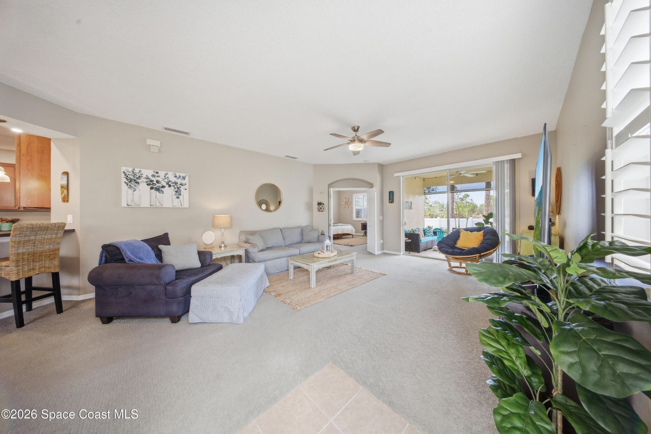 Welcome to this well-maintained 3-bedroom, 2-bath semi-attached single-family home offering 1,807 square feet of comfortable living, ideally situated on a quiet cul-de-sac in the highly desirable Capron Ridge community in Viera. Built in 2006, this home combines space, functionality, and peace of mind with HOA-covered exterior maintenance and a roof replacement completed in 2021. Step inside to discover an inviting layout with 10-foot ceilings, abundant natural light, and plantation shutters on all windows, adding both elegance and privacy. The spacious kitchen is designed for both everyday living and entertaining, featuring 42-inch cabinetry, a breakfast bar, and a double oven. The living and dining areas flow seamlessly, while all bedrooms are generously sized and equipped with ceiling fans for year-round comfort.The primary suite offers a relaxing retreat with a garden tub, double vanity, and ample space to unwind. Enjoy outdoor living in the covered lanai with retractable shutters, overlooking a private vinyl-fenced backyard--perfect for relaxing or entertaining. Additional highlights include a paver driveway and walkway, hurricane shutters, and a well-maintained A/C system replaced in 2017.Located in Capron Ridge, residents enjoy access to exceptional community amenities including a resort-style pool, clubhouse, fitness center, playground, tennis courts, and scenic walking trails. Conveniently located near top-rated schools, shopping, dining, and just a short drive to the beaches and major employers.This is a fantastic opportunity to enjoy the Viera lifestyle with low-maintenance living in one of Brevard Countys most sought-after communities.